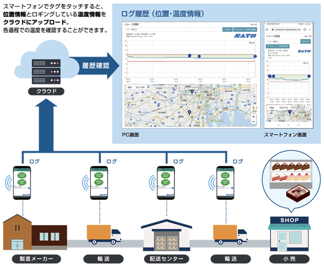 (3)輸送業者が商品を出荷時にスマートフォンを操作。スマートフォンの NFC 通信機能でクラウド上の温度推移管理システムに、その時点のスマートフォンの位置情報とそれまでの温度履歴データを送信。