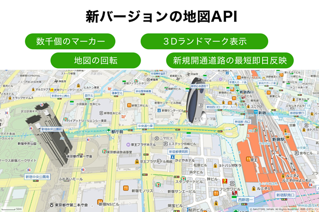 (株)ナビタイムジャパンは7月19日より、法人向け地図・ルート検索API「NAVITIME API」で、ナビゲーション機能と親和性が高く、移動や業務を支援する新バージョンの地図APIの提供を開始した。