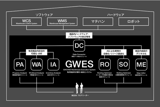 「GWES」はミドルウェアとなる共通データ基盤や、AIを適用した各種機能モジュール群から構成され、メーカーを問わず様々なハードウェア(MH機器・ロボット)やソフトウェア(WMS/WCS)とシームレスに連携することによりデジタル化を推進し、物流施設全体の最適化や可視化を実現する汎用性・拡張性の高いパッケージシステム。