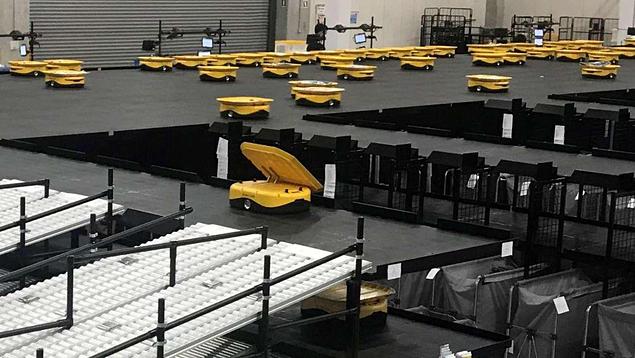 ●大規模2段式ソーティングロボットシステム。1防火区画内に収まるコンパクトなシステムにも関わらず空間を有効活用し、高い処理能力を実現している(上)、合計2ユニットで運用。1ユニットあたり、ロボット140台、使用面積120坪(投入台・周囲作業スペース等含まず)上下段の同一ロケーションシュートを同一仕分け先と定義することで、上下段でのバッチ分けが不要(下)