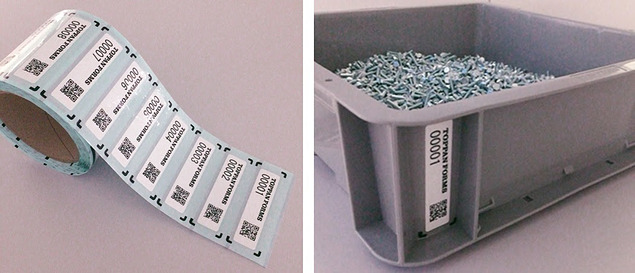 ●ロール状のオーバーフィルム一体型ICタグ(左)と、管理対象への貼付イメージ(右)