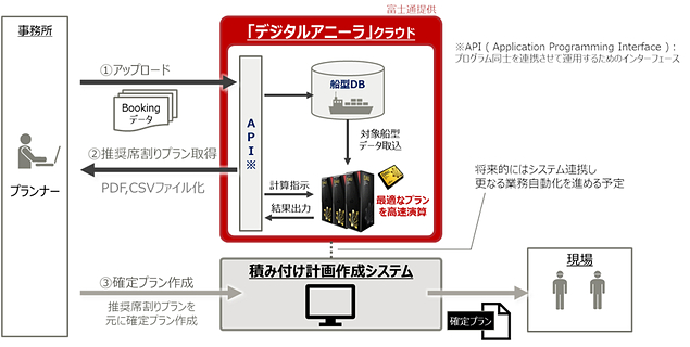 この課題の解決のため、日本郵船は富士通の「デジタルアニーラ」に着目し、積み付け計画作成業務に導入しました。「デジタルアニーラ」は、量子現象に着想を得たデジタル回路で、現在の汎用コンピュータでは難しい、膨大な組合せの中から最適なものを高速に導き出すことができる新しい技術です。「デジタルアニーラ」の導入にあたって、日本郵船の社内システムから積み込む車両のサイズや積み降ろす港の情報を取り込み、「デジタルアニーラ」によって解を求めることによって、積み付け計画作成業務の中で最も重要な席割り作業(様々な条件を考慮し車両の最適積載位置を計画する作業)を約30分で自動的に完了させるシステムをクラウド上に構築しました。