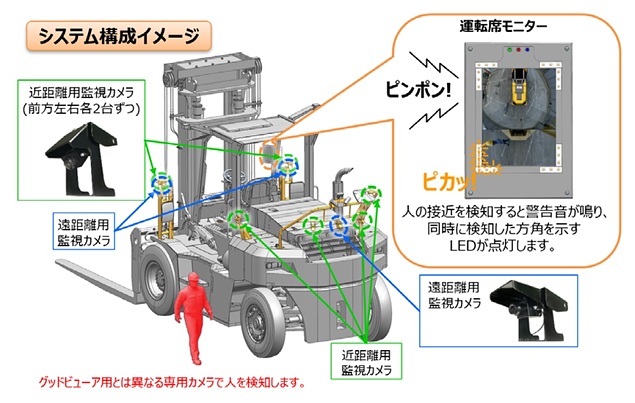 三菱重工業(株)と同社グループの三菱ロジスネクスト(株)は9月13日、大型フォークリフト運転時にAI(人工知能)で人の接近を検知・警告する機能を有したフォークリフトAI人検知システム「グッドファインダー」を、全国の三菱ロジスネクスト販売店を通じて販売開始した。