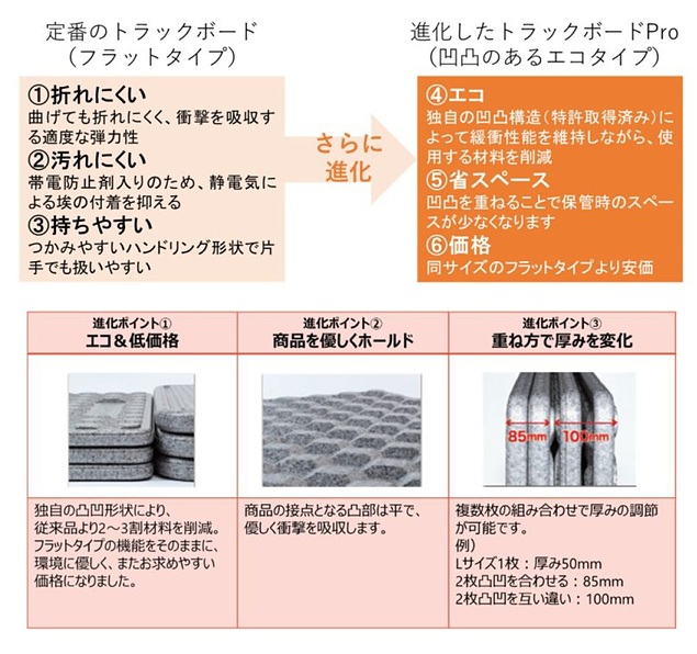 「トラックボード」シリーズは2001年の発売以来、累計150万枚を出荷した輸送用緩衝材の定番商品。「トラックボードPro」は表面に凹凸の構造を施したシリーズ商品で、高い緩衝能力と低価格を両立していることから、プロドライバーの支持を広げてきた。