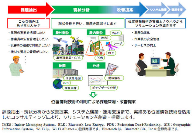 そのような背景の中、同社はGPS・準天頂衛星などの衛星測位活用技術、IMESや無線LANなどを用いた屋内測位技術、GISや衛星画像を活用した地図関連技術、そしてそれらに関するビッグデータの分析技術など、屋内・屋外での位置情報の利活用を推進してきた。例えば、関連機関と連携した商業施設や鉄道施設、物流倉庫、工事現場など屋内・屋外における実証実験では、利用者の動線の分析や設置物のレイアウトの最適化などを実施している。また、博物館での実証実験を一般財団法人衛星測位利用推進センターなどと共同で実施し、多くの実績とノウハウを蓄積している。本サービスでは、顧客の課題を抽出するとともに現状分析による課題を発見することで、位置情報を活用した業務改善およびシステム導入の提案を行うとしている。