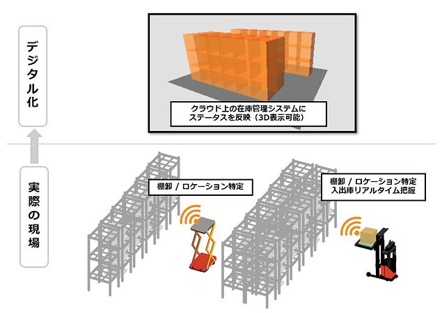 今回、共同開発したソリューションサービスは、物流支援ロボット「CarriRo」にRFIDを読み取るアンテナを設置。自動でRFIDが貼られた在庫の電波を収集し、同社の解析技術で位置を特定することで、人が介在せずとも自動的に棚卸・ロケーション特定し、マップに表示できるサービスとなる。