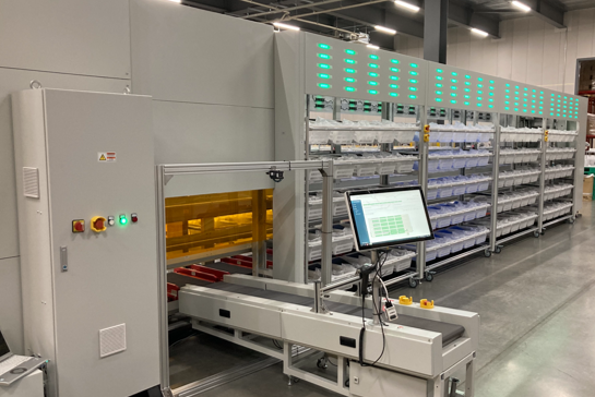 圧倒的に省スペースな立体型ソーター。自動で高速仕分けし、作業者は商品を投入するだけで、仕分け生産性が3倍以上に向上する。