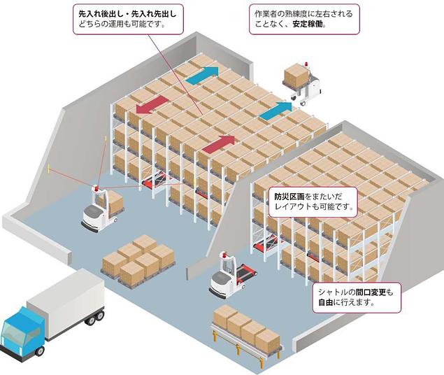 パレットの搬送に加え、有人でのフォークリフトでは難しい高段を含めたラック内のシャトルの間口変更もPLATTER Autoが自動で行うため、人手作業を大幅に減らすことができる。作業量、必要能力に応じて入庫はPLATTER Autoによる全自動、出庫は従来のフォークリフトを使用するといったフレキシブルな運用も可能。