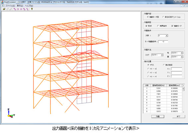 また当システムは、図面を作成するだけで解析することができ、さらに床の振動を3次元アニメーションで表示できるため、初めてシステムを使用する場合でも入力・解析・結果の表示まで短時間で行うことができる。