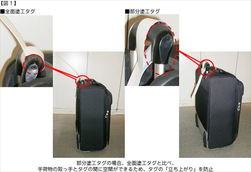 手荷物タグは通常、のりを裏面全面に塗布しているのに対し、新機能タグは一部のりを塗布しない領域を設けた部分塗工を初めて採用した(特許申請中)。タグ使用時は両端部分のみ貼り付くため手荷物の取っ手とタグの間に空間ができ、従来発生していた手荷物上方にタグがはみ出る「立ち上がり」現象を防ぐことができるのが特徴。