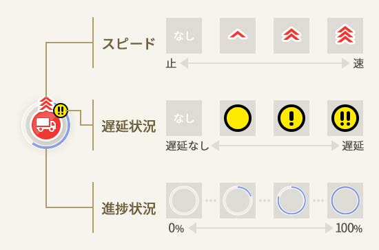 車両アイコンは、管理者がパソコンの管理者画面(ブラウザ)で、複数の作業者の現在地や進行方向などを確認できる機能。今回のリニューアルでは、新たに追加する車両のスピード情報と、業務の進捗状況、遅延状況をリアルタイムにひと目で把握できるデザインに変更した。