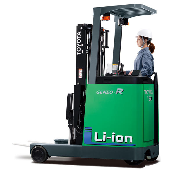 (株)豊田自動織機・トヨタL&Fカンパニーは8月24日、1.35~1.8t積リーチタイプ電動フォークリフト「GENEO-R(ジェネオR)」に、日本初となるリチウムイオンバッテリーを搭載したオプション車を、9月より全国40社のトヨタL&F取扱店を通じて販売すると発表した。