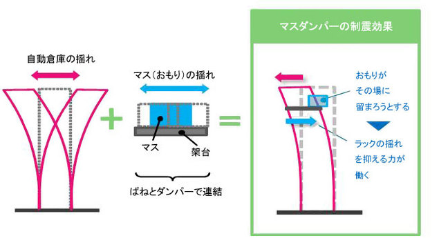 自動倉庫のラック上部の本来荷物を置くスペースを利用し、荷物を収納する要領でマスダンパーを配置し、専用の取付金具でラックに固定する。マスダンパーはパレットサイズの装置なので、自動倉庫のスタッカークレーン(自動搬送機)を利用して、迅速に配置できる。既存の倉庫でも稼働しながらの改修が可能。