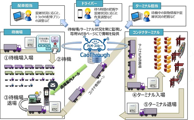 車両待機場/コンテナターミナル双方にETC路側装置を設置することで、埠頭全体の待機車両台数や待ち時間を把握し、専用Webページを通じて「見える化」される結果、ターミナル周辺道路の渋滞緩和だけでなく、ドライバーの負荷低減や配車の効率化などが期待される。