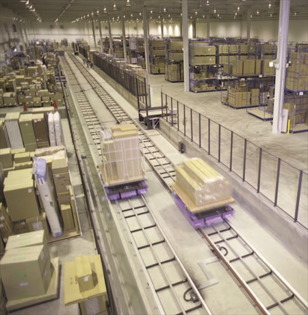同店への商品供給を担う大阪物流情報センターは、スタッカークレーン5台、格納数4,300パレットの保管能力を持つパレット自動倉庫「コンパクトシステム」(ダイフク製)を設置。荷捌き場に設けた5か所の入出荷ステーション間を高速搬送台車「ソーティングトランスビークル」(同)8台で結び、スピーディな入出庫を行っている。従来なら30名以上を要する物流業務を約20名まで削減することができた。
