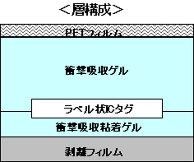 本製品は、同社とタキロン(株)が共同で開発したもので、特殊なゲル状のタキロン製衝撃吸収材でラベル型のICタグ全体を覆い、表面をプラスチックフィルムで封止することで、外部からの強い衝撃に対する耐衝撃性を高めた。