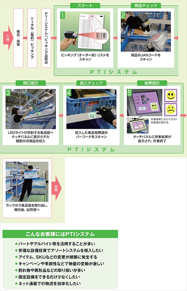 PTIシステムでは、トータル(集約)ピッキング後の出荷先別仕分けが効率的に行える、まったく新しいアソート(種まきピッキング)システムとなっている。視認性に優れたLEDライトによる投入間口の指示と見やすいタッチパネルによる投入数指示で、ミスを最小化し高い作業生産性を実現する。とくにLEDライトに関しては、照射位置を作業者に分かりやすくするため、中央のセットポジションから光の軌跡で誘導する方式(特許)を採用。光の軌跡を追えば、作業者は投入間口を迷わず確認できる。