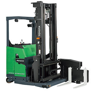 ラックストッカーは、フォーク部分が左右に180度回転することにより、車両の向きを変えずに前方・左右3方向の荷役作業が可能なフォークリフト。ラック(棚)間の通路幅を車両幅とほぼ同等に抑えることができるため、スペースを有効に活用できるのが特長だ。