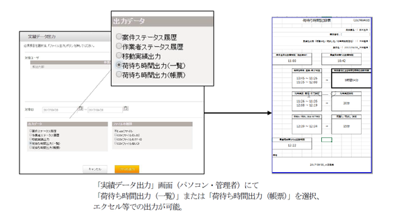 今回、同ソリューションの「実績データ出力」機能を拡張することで、省令を考慮した「荷待ち時間」をはじめとした業務時間の記録、およびフォーマットの出力が可能になった。省令では30分を超えた場合に記録を必要とするが、サービス上で簡単に記録・出力ができるため、日頃の業務記録としても活用可能。