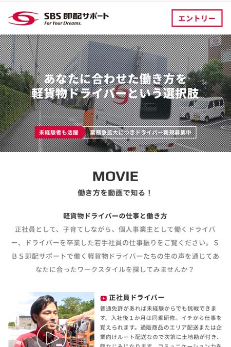 その対応として、スマホとパソコンの両方に対応した採用専用のウェブサイトを構築、採用動画をフル活用し、軽貨物ドライバーの魅力を短時間でアピールできるシンプルな構成とした。