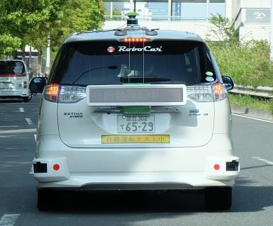 運転席にドライバーが乗車していない状態でのサービスを想定し、自動運転車の様子を示す表示器を設置。「自動運転中」、「ありがとう」といった表示を行い、後方車両から表示内容の確認を行った。