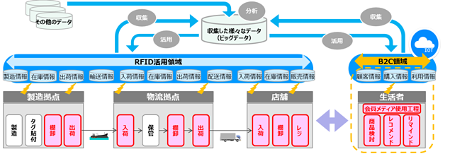 同サービスは生産地でRFIDを貼付し、以降のあらゆるプロセス(製造拠点、物流センター、店舗等)での活用により作業効率を高め、省人化や作業品質のさらなる向上を実現。また、RFIDで取得した製造、入出荷、販売等のデータを活用し、廃棄ロスや機会ロスを最小限にするとともに、より的確な需要予測、サプライチェーン全体での最適な在庫配置、人々のニーズに合った新製品開発と店舗での新たな顧客アプローチを行うなど、次世代のマーケティング手法の確立を進める。