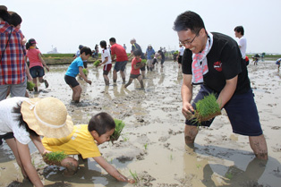 今年は、同社グループ従業員とその家族、及び守山市地域住民の方など、計215名が参加した。当日は田植え作業を通じて、水田周辺に生息する生物を観察するなど、親子が一緒に学ぶことにより、自然の尊さ、大切さを感じることができたものと考えている。