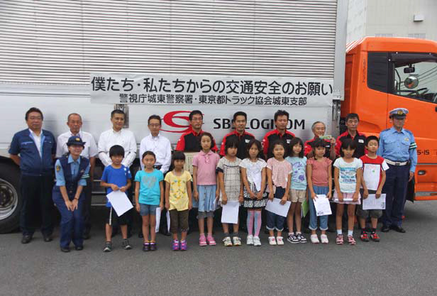 SBSロジコム(株)は、警視庁城東警察署が主催する「小学生の運送事業者等に対する交通安全活動」に協賛し、7月9日、同社新砂支店(東京都江東区新砂)にて小学生との交通安全セレモニーを行ったことを発表した。