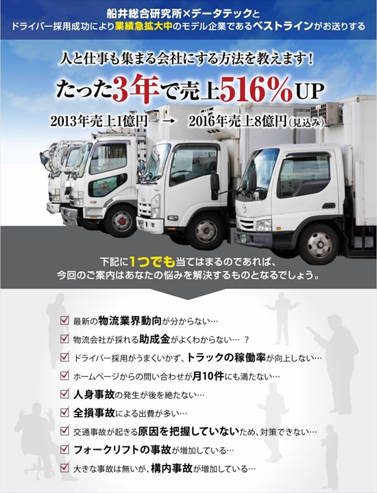 ドライバー採用に成功しただけでなく、交通事故が減り業績向上に成功した物流企業・(株)ベストライン代表取締役社長の辰巳千里氏が自らの体験を事例報告するほか、(株)船井総合研究所経営コンサルタントの高橋竜二氏が、事故が少なく好業績を挙げている運送会社の成功事例について講演する。
