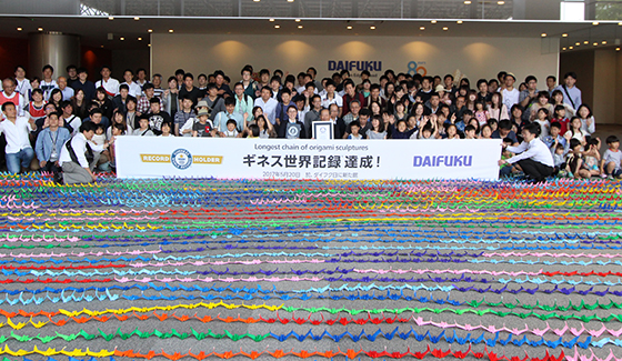(株)ダイフクは創立80周年を迎えた5月20日、滋賀事業所内の総合展示場「日に新た館」において、グループ会社社員とその家族235人で「Longest chain of origami sculptures(折り紙作品の最も長いチェーン)」のギネス世界記録に挑戦、これまでの記録(2,855個)を上回る5,510個の折り紙を繋いでチェーンを完成させ、ギネス世界記録を更新した。