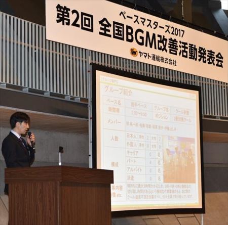また、BGM改善活動発表会(各部門3グループ 計9名出場)は、ベース作業の改善活動について発表し、活動の自主性、創意工夫、全員参加、継続性、水平展開性などを審査するもの。(1)グループ部門で全国から選抜されたグループの改善活動について、小集団のリーダーが発表、(2)統括グループ長部門で全国から選抜された改善活動について、統括グループ長が発表、(3)管理者部門でベースマネジメント事例について、本社が推薦するベース長が発表した。