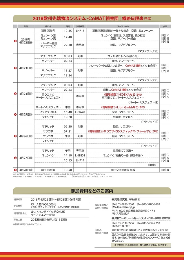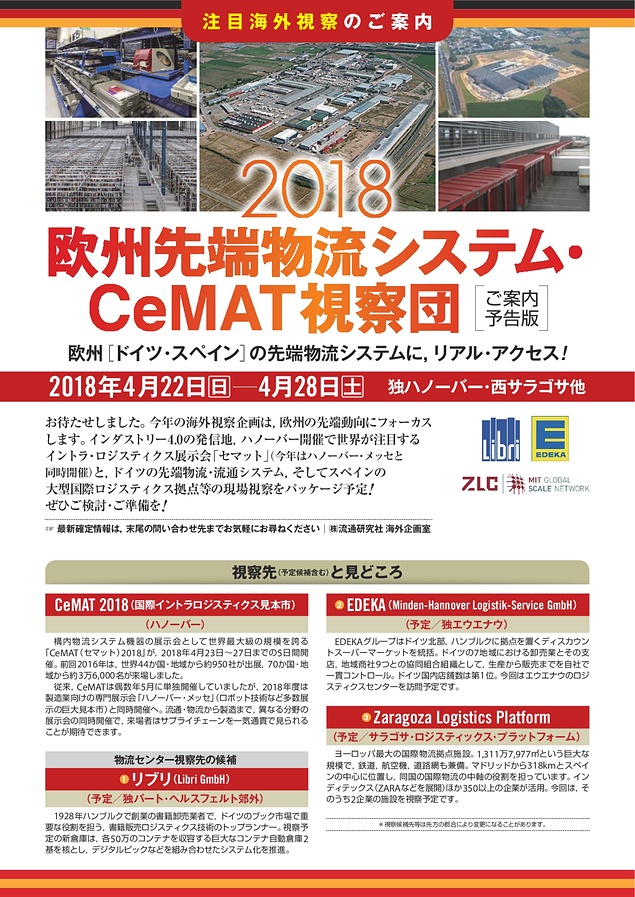 期間は2018年4月22日~4月28日、独ハノーバー・西サラゴサ他を訪れる予定で、CeMATの見本市ほか、書籍販売ロジスティクスのトップランナーとして知られる独・リブリの新倉庫はじめ、物流人必見の先端現場見学予定が目白押し。