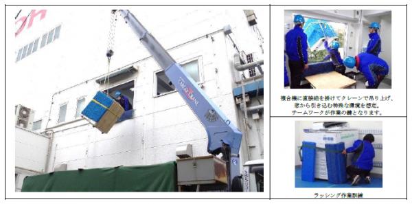 クレーンの特性や玉掛け作業の法的要求事項や事故事例に理解を深めた後、大型複合機のラッシング作業(※)を実技で講習。続く搬入出訓練では、クレーン車両で複合機を吊り上げ、窓から引き込む作業を行った。吊り上げ時の紐の掛け方、室内へ複合機を引き込んだ後、一時的に複合機を乗せる冶具類の置き方等、安全を最優先させたノウハウについて学びを深めたという。