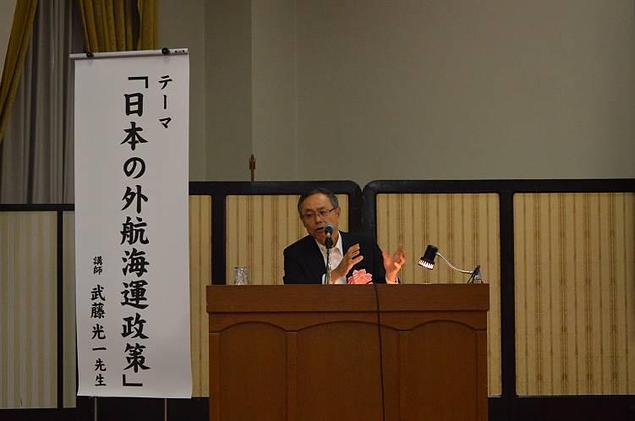 今回は(一社)日本船主協会の会長であり、(株)商船三井の取締役会長の武藤光一氏が「日本の外航海運政策」と題して講演。参加者は、会員企業の代表者や幹部等約80名にのぼった。