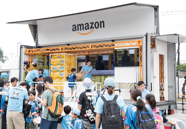 アマゾンジャパン(株)は7月20日、川崎フルフィルメントセンター(FC)の近隣に所在するJリーグ・川崎フロンターレの「2019ファン感謝デー」にコミュニティパートナーとして参加し、チームの後援会会長である川崎市の福田紀彦市長と夏休み中の500名の親子を招いて、日本初の物流施設をテーマとしたSTEM教育を体験できるMobile FC(仮称)の披露式を行った。