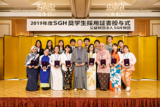 第34期生となる2019年度SGH奨学生16名(学部生9名、大学院生7名)は、国公私立各大学の学長より推薦を受けた私費留学生112名の応募から、SGH奨学生選考委員会による厳正な審査を経て採用された。奨学生には奨学金月額12万円がSGH財団より2年間給付される。