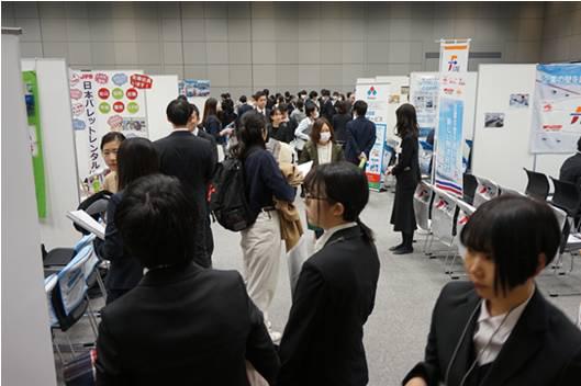 当日、参加学生は会員企業35社が構えるブースを自由に訪問しながら各社の会社概要や事業内容の説明(1クール30分で9クールのタイムスケジュール)を受けることを通じ、陸・海・空・倉庫・フォワーダー等、多業種で構成される物流企業の役割や使命等、様々な情報を収集した。