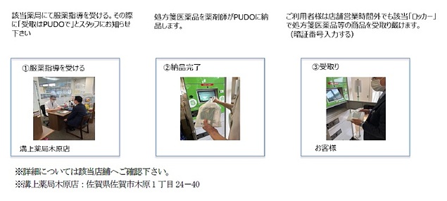 ローソン併設の溝上薬局木原店に設置してある「PUDOステーション」で、処方箋医薬品を顧客へ受け渡しする拠点として利用可能となる。
