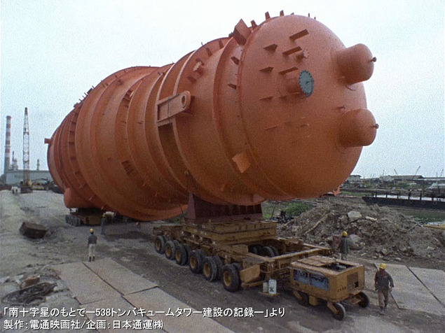 内容:シンガポール西部のジュロンの工業地帯に立地するモービルオイル・シンガポール精油所において、千代田化工建設(株)が潤滑油製造プラントの建設を行った際に、日本通運(株)が手がけた巨大なバキュームタワーの水切り・運搬・据え付け作業を記録した映画。
