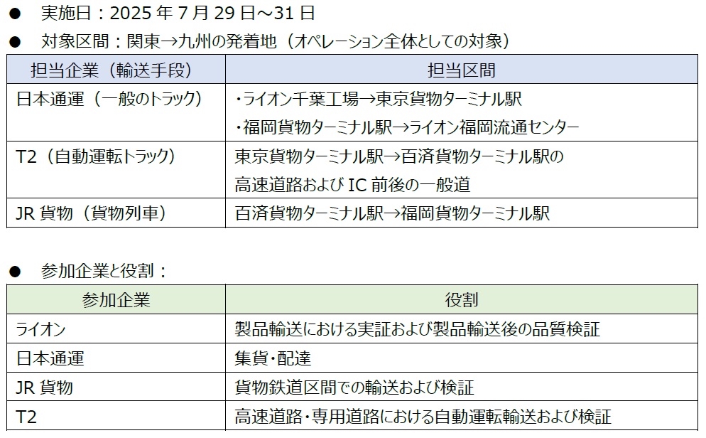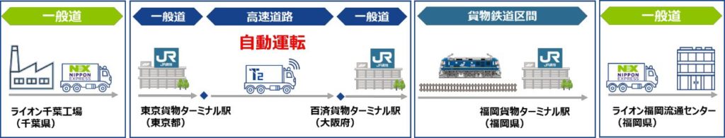 実証では輸送の役割として、▼ライオンの千葉工場から東京貨物ターミナル駅(東京都)までを日本通運、▼東京貨物ターミナル駅から百済貨物ターミナル駅(大阪府)までをT2のレベル2(※4)自動運転トラック、▼百済貨物ターミナル駅から福岡貨物ターミナル駅(福岡県)までをJR貨物の貨物列車、▼福岡貨物ターミナル駅からライオン福岡流通センターまでを日本通運が担った。