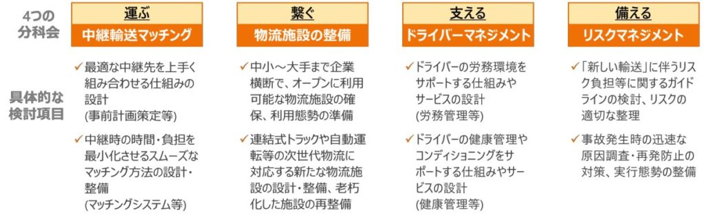 また、中継輸送に次ぐ取り組み領域として、ドライバーの労務環境や健康状態の改善を通じて、効率的で持続可能な物流の構築を目指す。それらの実現に向けて4つの分科会活動を本格的に稼働させ、企業や業界を超えた価値共創に取り組んでいくとしている。