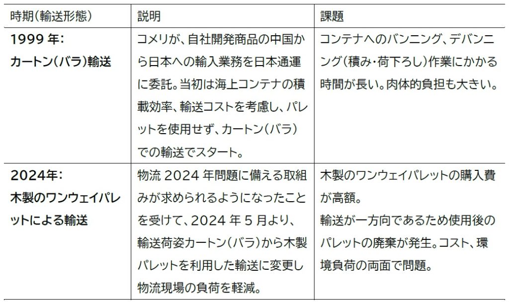 (4)日本通運が輸入港からコメリ物流センターまでドレージ(陸送)し、海上コンテナからのデバンニング(コンテナからの荷下ろし作業)をパレットで行う。【省力化】