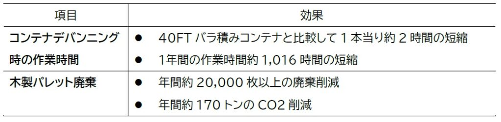 人手不足が深刻化している物流業界では、物流の結節点で生じる手荷役作業に起因する長時間労働や過重な肉体的負担の解消が求められており、本件取り組みによる一貫パレチゼーションの導入は、海上コンテナへの積み込み時間を年間約1,016時間削減する効果が期待されるほか、従来発生していた木製パレットの廃棄にかかる環境負荷を軽減する。