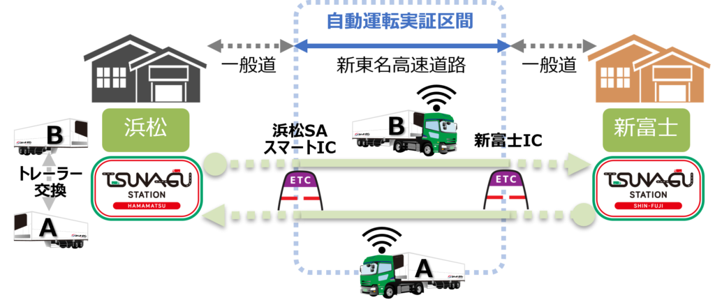 今回の公道実証走行では、高速道路上における安全かつ安定的な無人走行技術の確立を主な目的とし、新東名高速道路の新富士ICから浜松SAスマートICまでの区間において、ロボトラックが技術開発した自動運転セミトレーラの公道実証走行を実施する。また、発着地として設定する「TSUNAGU STATION」では、中継輸送を想定したトレーラ交換による物流効率化の検証を行う。