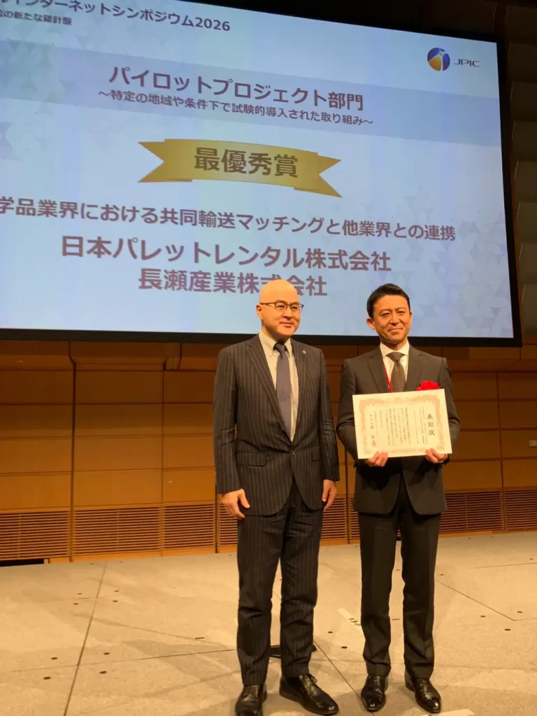 日本パレットレンタル㈱(JPR)は2月27日、化学品業界における物流効率化を目的とした「化学品業界における共同輸送マッチングと他業界との連携」の取り組みにおいて、(一社)フィジカルインターネットセンター(JPIC)が主催する「フィジカルインターネットアワード2026」のパイロットプロジェクト部門最優秀賞を受賞し、前日の2月26日に東京都内で開催された授賞式で長瀬産業㈱と共に表彰されたと発表した。