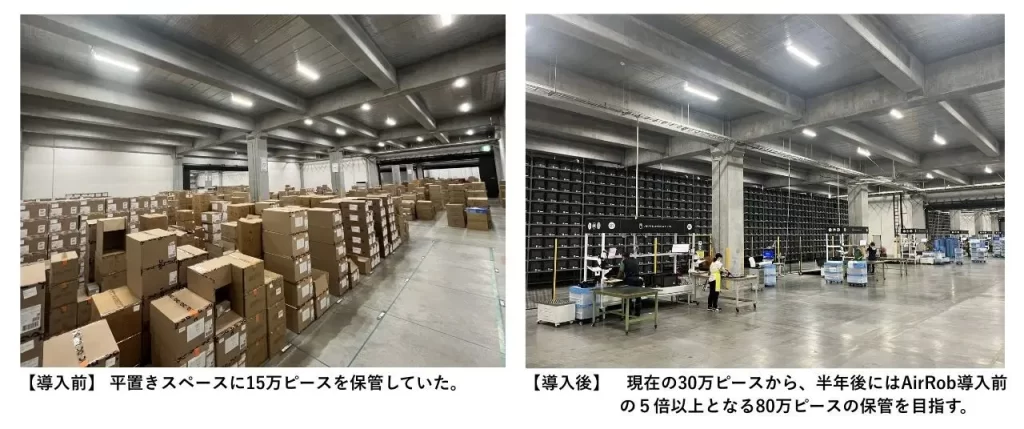 流山LCは、2018年からセンコー㈱がUAの物流機能を受託運営している既設倉庫で、今回のAirRob導入は、UAのOMO物流戦略に伴う物流業務のさらなる効率化とキャパシティ向上を目的としたもの。導入は、2,000坪における約6万9,000保管ロケーションに対して、システム構築と保管能力の拡張をいずれも2段階に分けて行う計画。今回の導入の決め手は、AirRobが大規模ソリューションでありながら保管量2万ピースから始められる点、段階的な運用が可能でオペレーションに影響を与えずに拡張できる点としている。