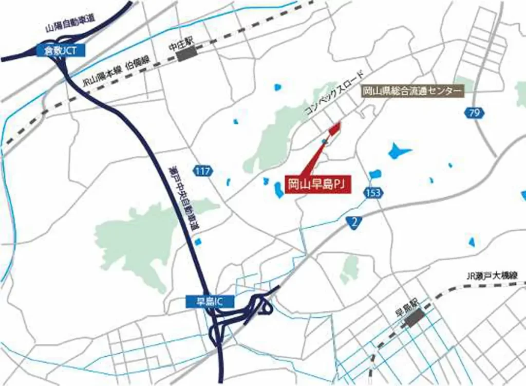 同物件は中四国エリアにおける結節点として近年注目を集める山陽自動車道・早島ICから約3kmに位置し、西日本への広域配送拠点に適した立地。2025年11月よりテナントの1棟利用が決定している。