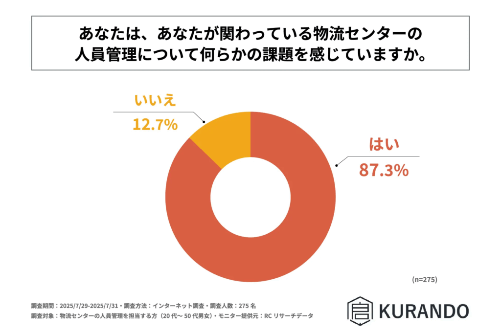 ㈱KURANDOは8月21日、物流センターで人員管理を担当する方を対象に「物流センターの人員管理」に関する調査を実施したと発表した。同調査から、物流センターにおける人員管理の課題や人員配置・シフト管理の方法等が明らかになった。
