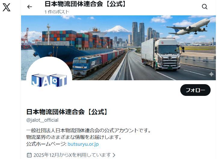 (一社)日本物流団体連合会(物流連)は1月8日、物流業界の社会的認知向上を目的に、公式X(旧Twitter)アカウントを1月6日に開設したと発表した。