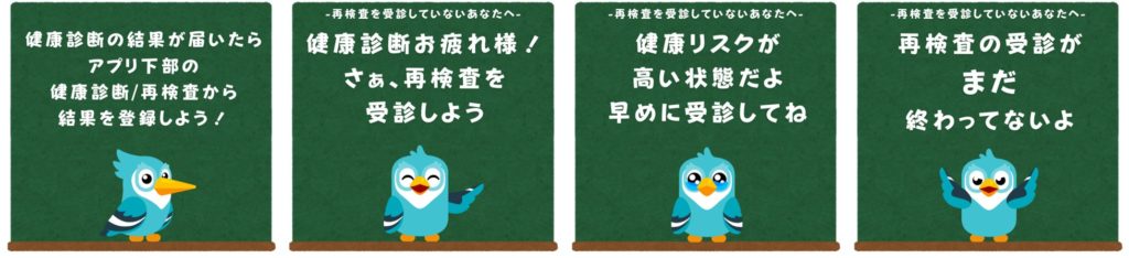 従業員の進捗状況に応じて、健康診断結果入力のリマインドや受診勧奨を自動でプッシュ通知する。